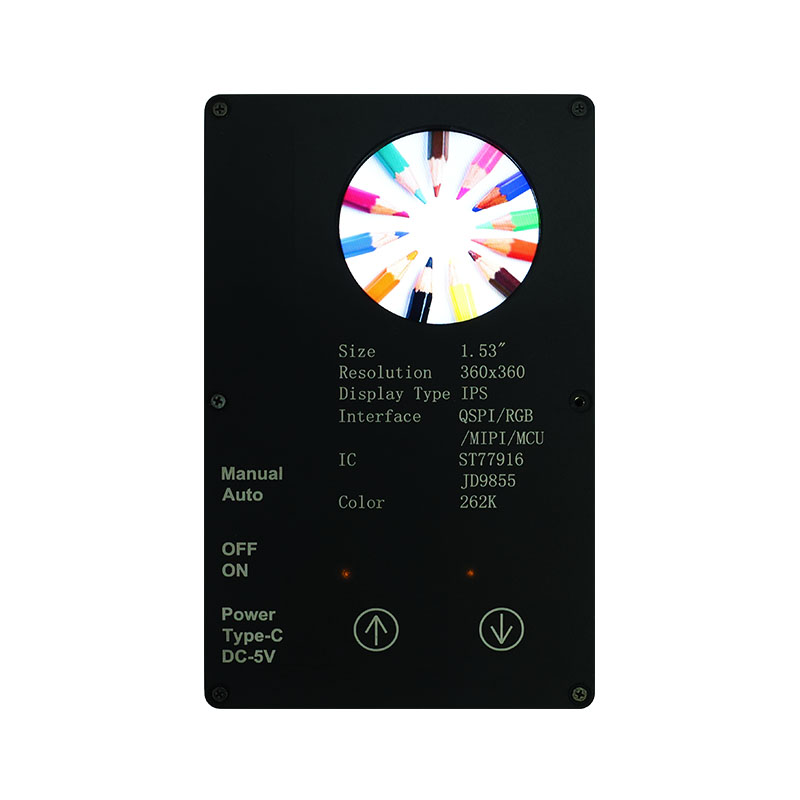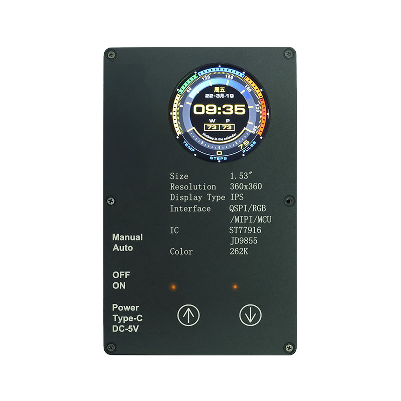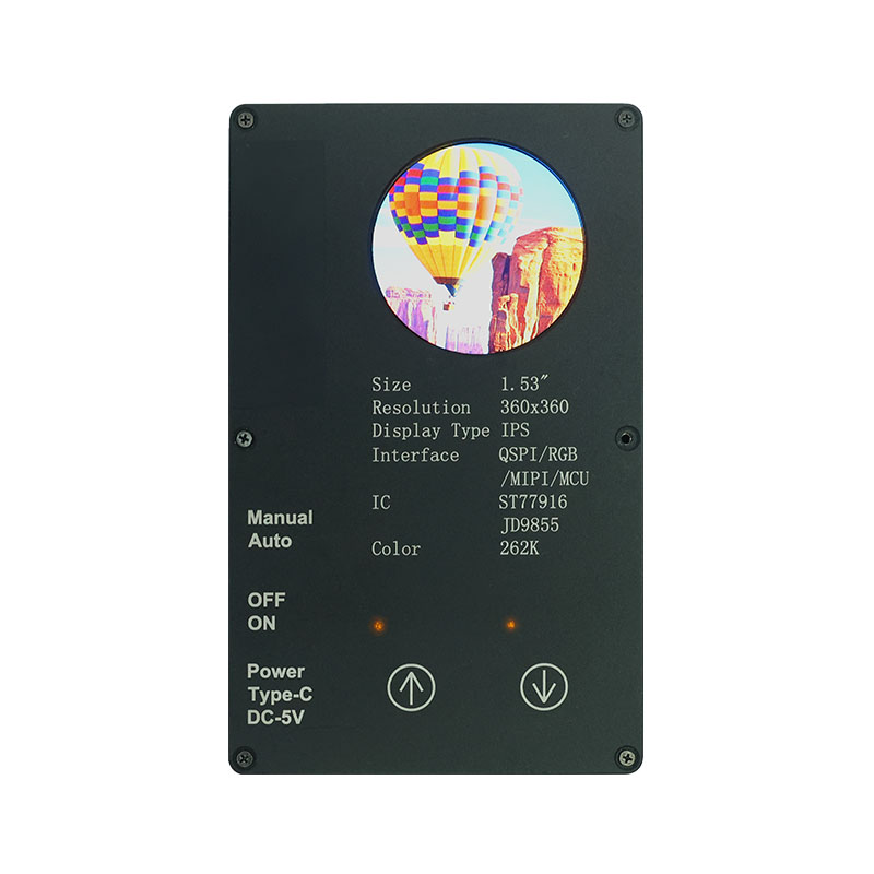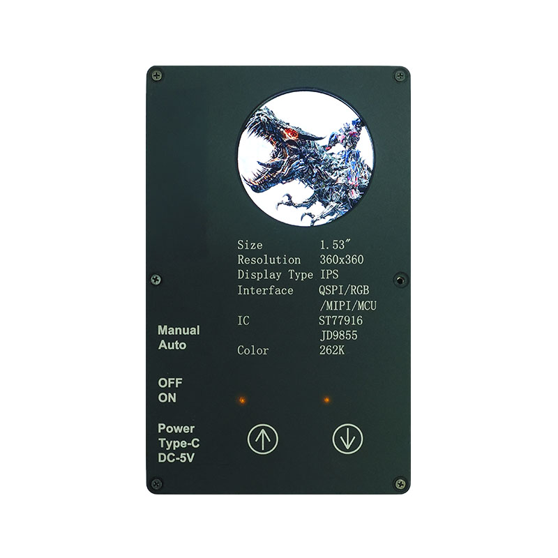 Tässä mukautetussa näytössä on 360 × 360 korkea resoluutio, kaikki katselukulmat ja 400 cd/m² korkea kirkkaus. Teollisuusluokan käyttölämpötila-alueella (-20 ℃ ~ 70 ℃) se varmistaa selkeän ja vakaan suorituskyvyn älykkäissä kodin sovelluksissa, kuten punkinpoistolaitteissa ja mehupurissa. QSPI-liitäntä ja ST77916 Drive IC mahdollistavat nopean tiedonsiirron, kun taas sen kompakti moduulikoko (40,46 × 41,96 × 2,16 mm) maksimoi tilan tehokkuuden.