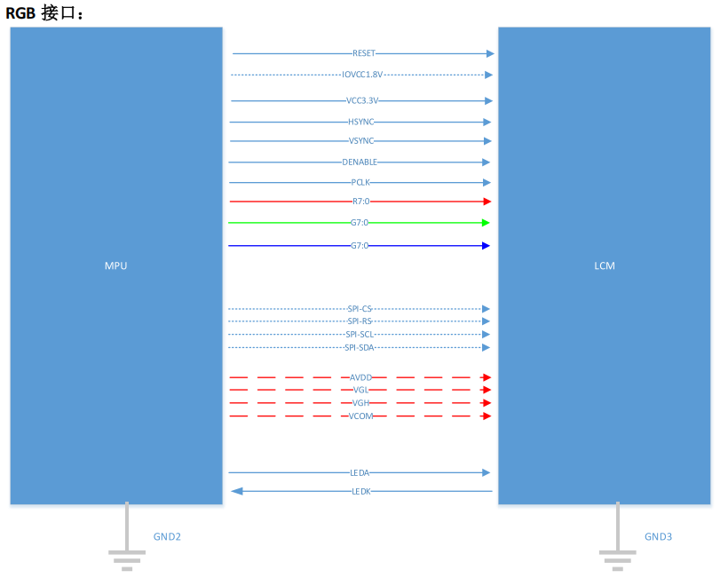 2. Selkeät toiminnalliset rajat: Puhdas RGB-liitäntä on nopea "yksisuuntainen näyttötietokanava", joka ei pysty lähettämään alustuskomentoja tai lukemaan tilaa. Näin ollen mukautetuissa LCD-projekteissa se tekee usein yhteistyötä ohjausliitäntöjen, kuten SPI:n, kanssa, jotka käsittelevät näytön alustusta ja hallintaa.