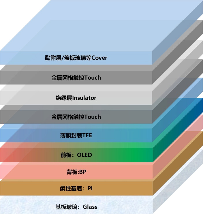 Sen ydinrakenne sisältää OLED-valoa lähettävän kerroksen, TFT-taustalevyn, metallielektrodit, alustalasin ja kotelon.