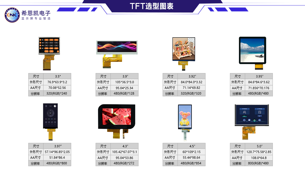 Värinäytöllisten TFT-moduulien osalta yritys on hallinnut koko valmistusprosessin lasin leikkauksesta, polarisaattorin kiinnityksestä ohjainpiirin liittämiseen ja taustavalon kokoonpanoon. Sen tuotteet tukevat erilaisia ​​ajomenetelmiä, kuten RGB-liitäntää, MCU-liitäntää ja SPI-liitäntää, ja ne voivat mukautua joustavasti erilaisiin pääohjausalustoihin.